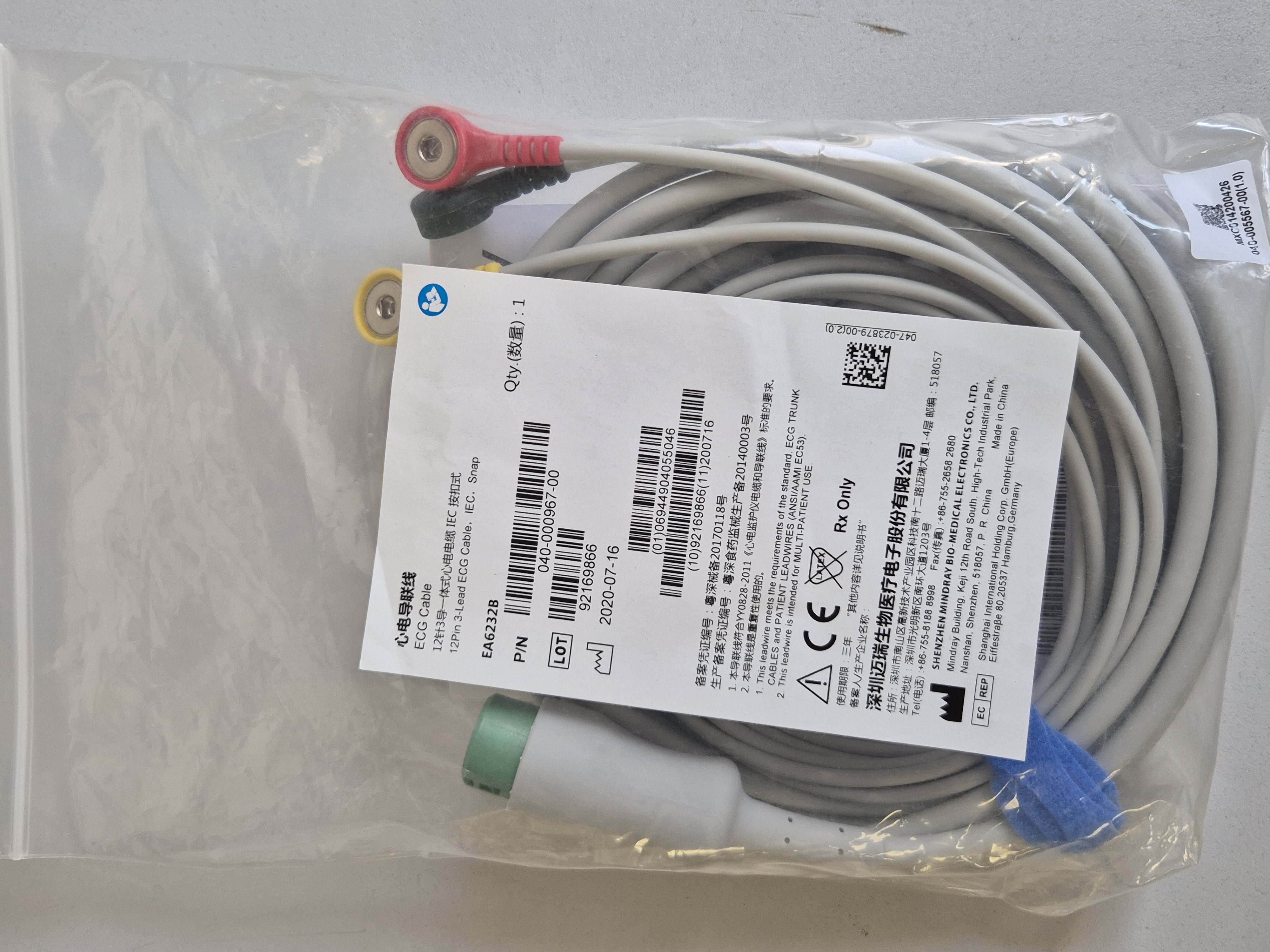 CABLE ECG 3 BRINS A PRESSION MODELE EA6232B, P/N: 040-000967-00